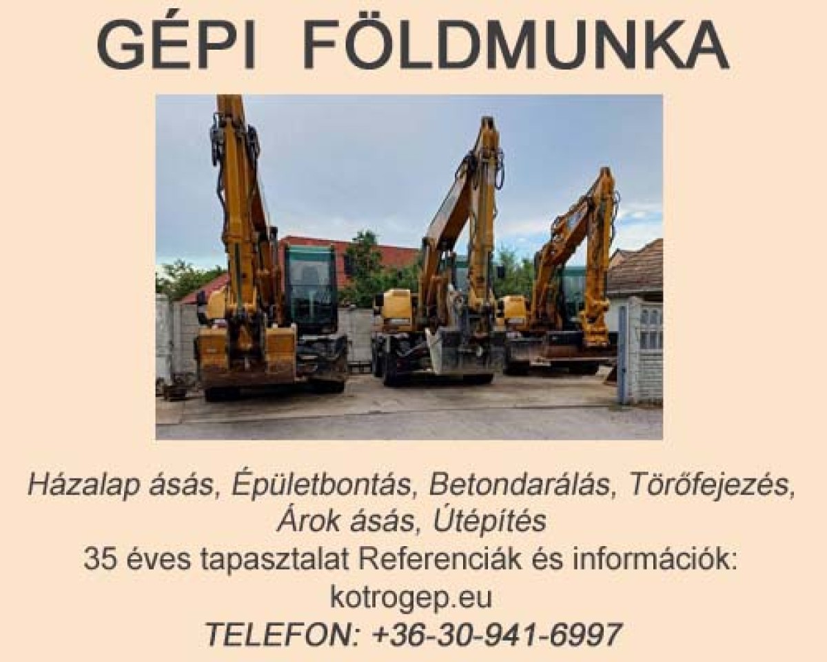 Vállalkozásunk 1990-ben alakult , ipari és lakossági földmunkák végzése. Vállalunk : -pince tömb kiszedést - terepreprendezést - épület bontást - gépi törőfejezést - forgó kotrógép bérbeadása kezelővel Mutass többet Ajánlatot kérek tőle Egy perc és neked teljesen ingyenes 06309416997 Hívás telefonon Referenciák